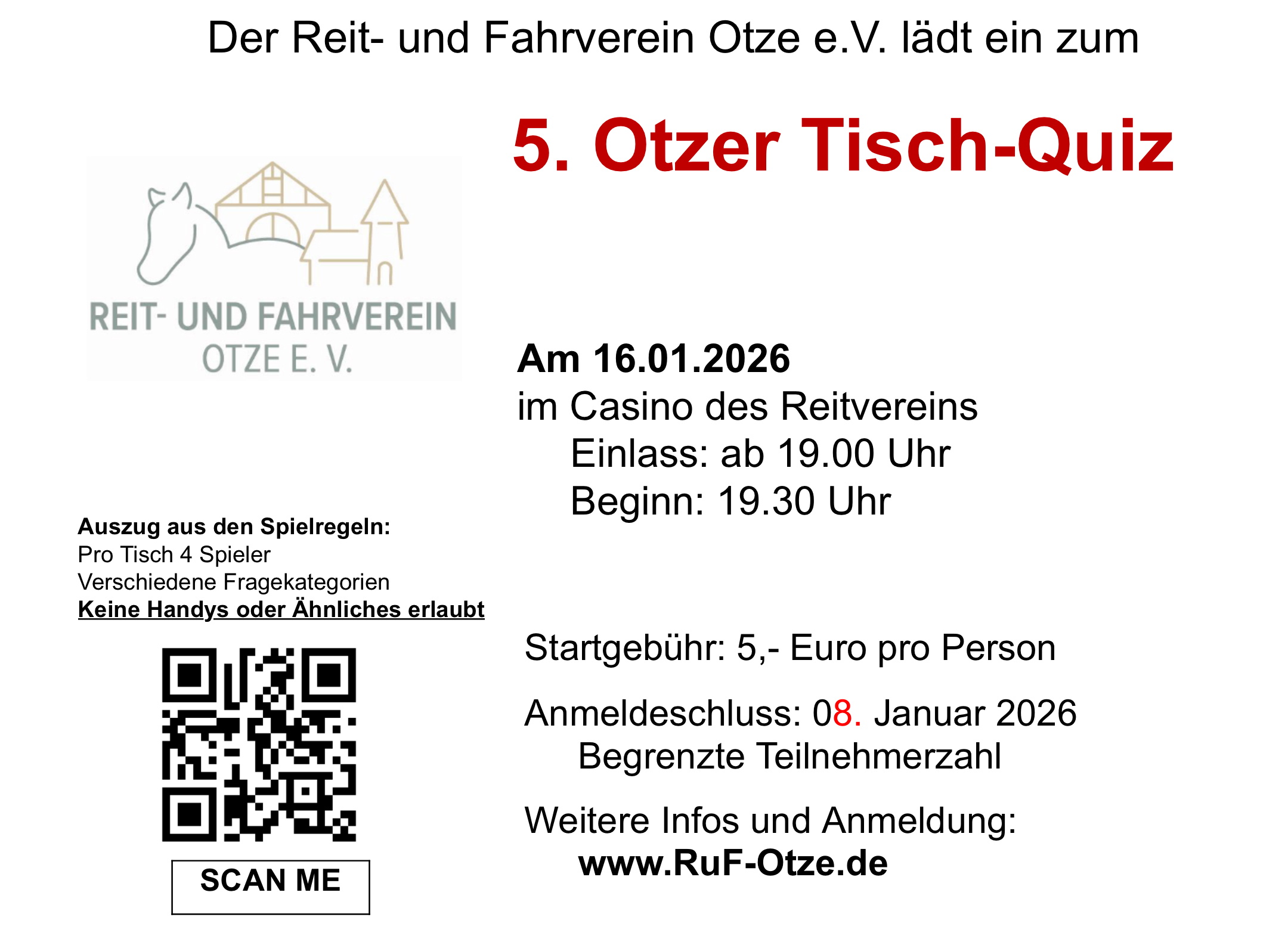 Der Reit- und Fahrverein Otze e.V. lädt ein zum 2. Otzer Tisch-Quiz am 13.01.2023, 19.00 Uhr im Casino des Reitvereins. Zur Anmeldung einfach den untenstehenden Zettel ausfüllen und per E-Mail an info@ruf-otze.de. Startgebühr: 4,00 Euro pro Person Anmeldeschluss: 05. Januar 2023 Begrenzte Teilnehmerzahl Es gelten die dann gültigen Corona-Regeln...